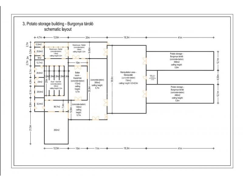 - Több ezer nm beton és téglaépület, mely burgonya tároló és szárító üzemként funkcionált.