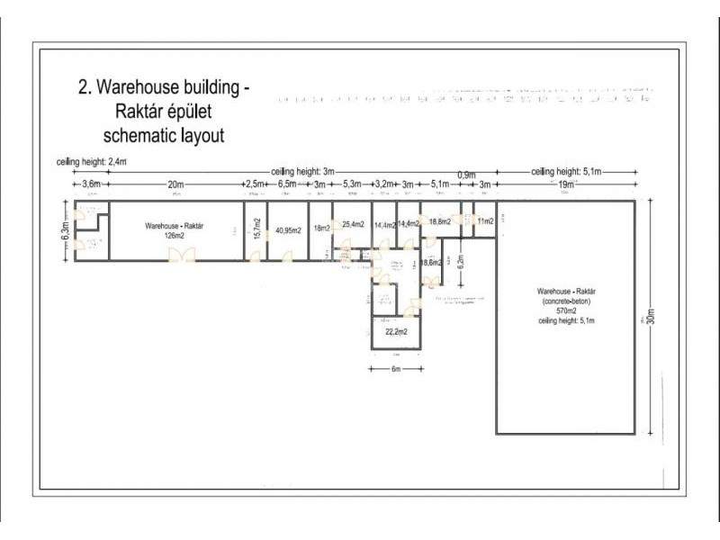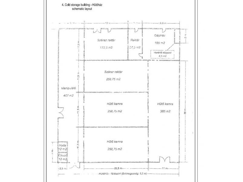 - 2100 nm többhelyiséges raktárépület, mely 3 db összesen több mint 900 nm működő hűtőkamrát magába foglal. Belmagasság: 6,3 m.