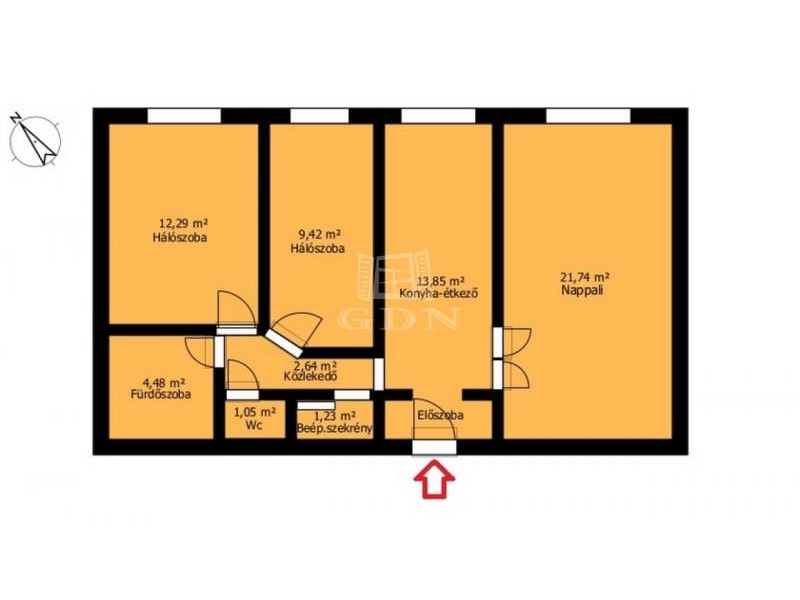 Elosztása : tágas nappali, 2 hálószoba, konyha-étkező, fürdő- wc