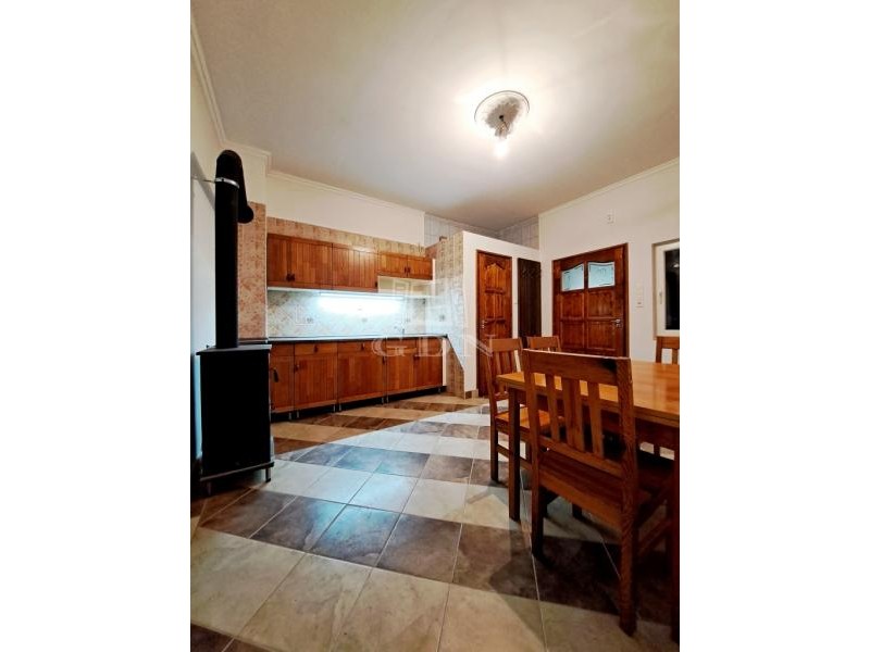 Fa konyhabútor, ebédlőasztal székekkel, vegyes tüzelésű kályha.