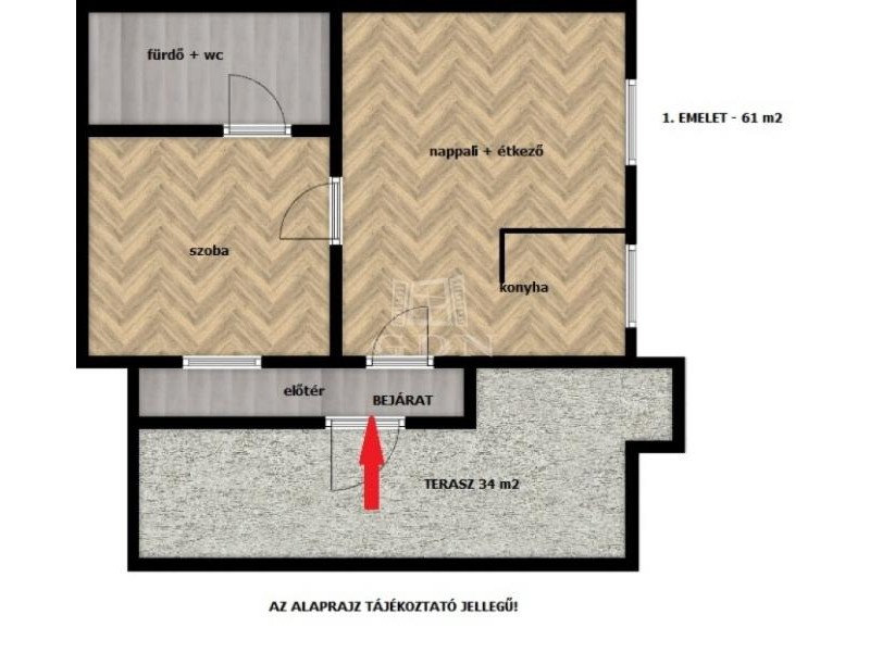 1. EMELET: 61 m2 – 2 szoba – 1 fürdő – TERASZ: 34 m2