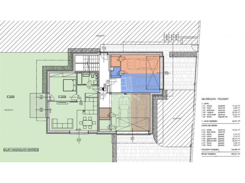 Alapterület: 62,91 m² + 9,94 m² terasz + 133,82 m² kizárólagos használatú kert