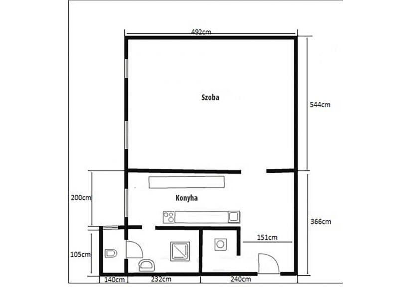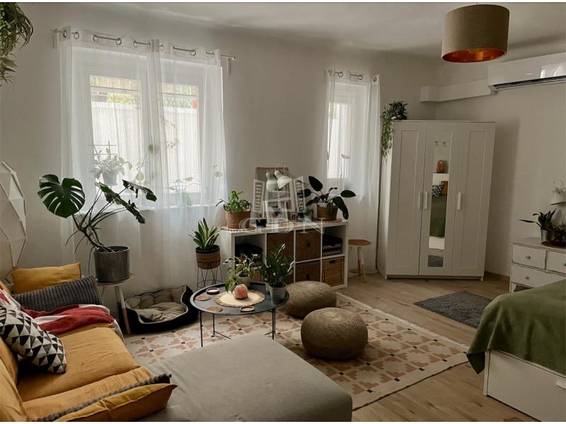 A lakás egy tágas szobából áll, melynek ablakai a kellemes kertre néznek, így garantálva a nyugodt, természetközeli életérzést.