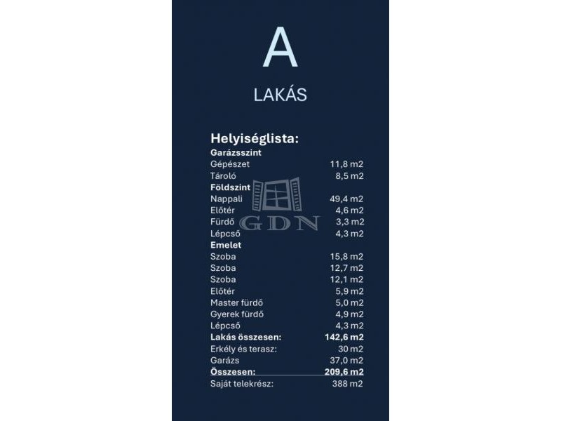 Az ikerház másik felét egy hasonló elrendezésű lakás képezi, amely 118 m² lakóterülettel, 35 m² terasz/erkéllyel és 2 db felszíni beállóval rendelkezik; bruttó vételára: 222,5 millió Ft.