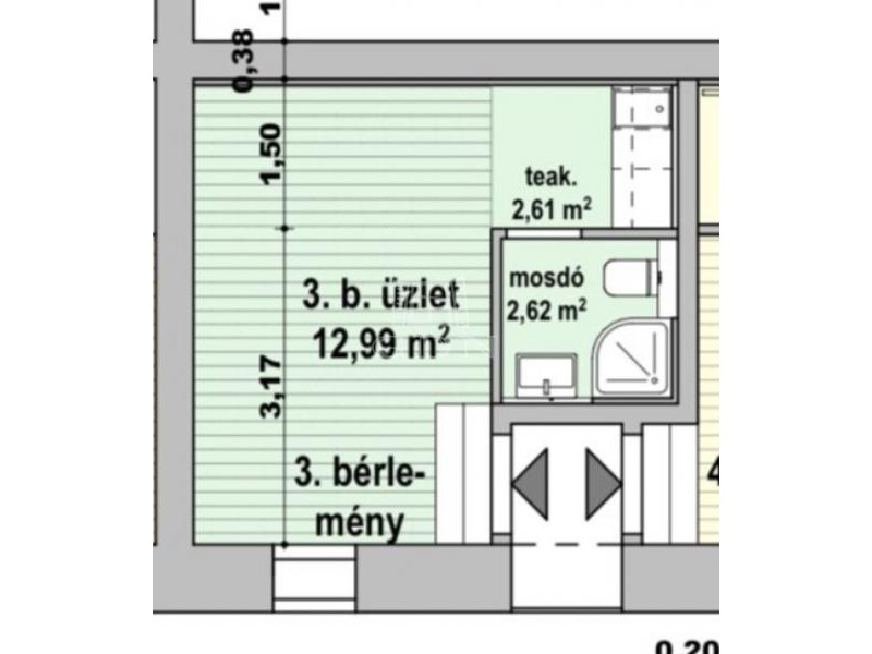 Az üzlethelyiségben zuhanyzós fürdő, wc, konyhabútorral felszerelt teakonyha is található.