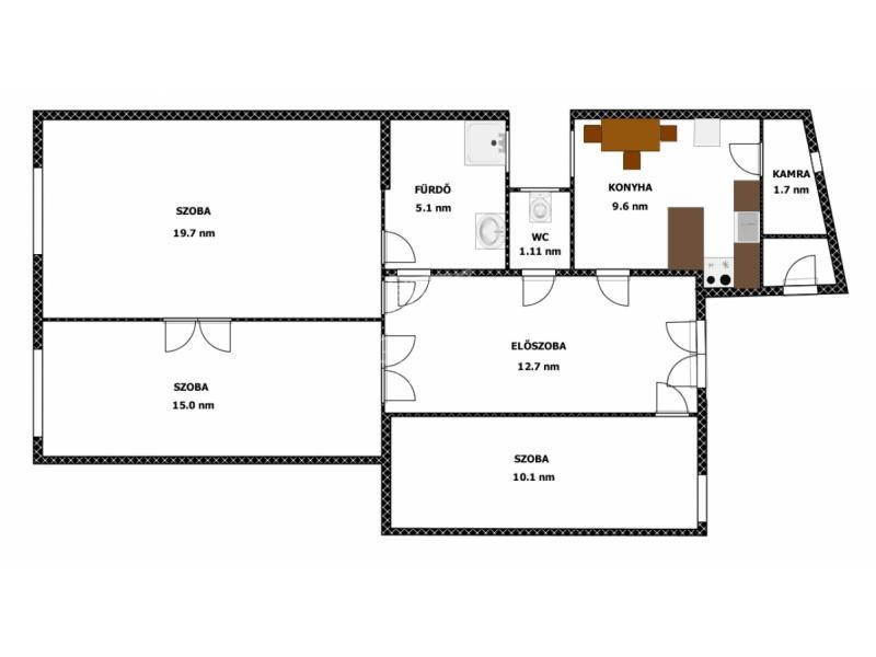 Elosztása: 3 külön nyíló szoba, konyha, fürdőszoba és külön WC.