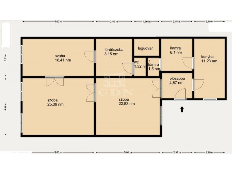 A nagy étkezős konyhához kamra és egy különálló, gardróbnak vagy tárolónak alkalmas cselédszoba kapcsolódik.