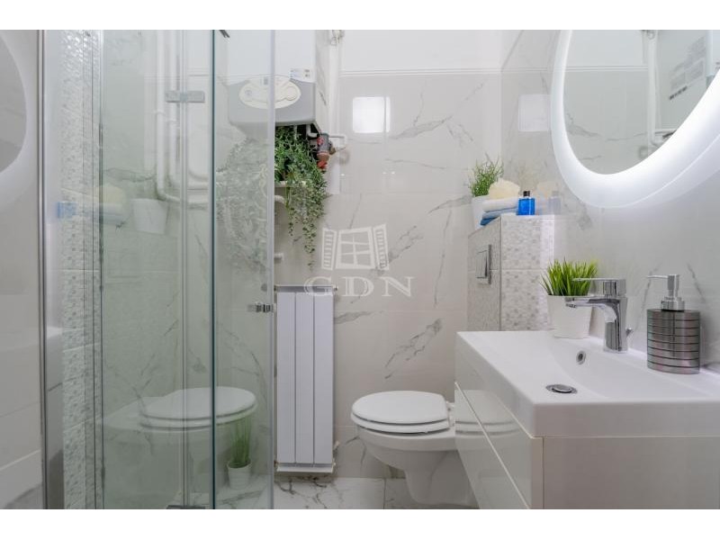 A fürdőszoba nem nagy, de jól átgondolt: zuhanyzó került kialakításra, itt található az Ariston kombi cirkó is.