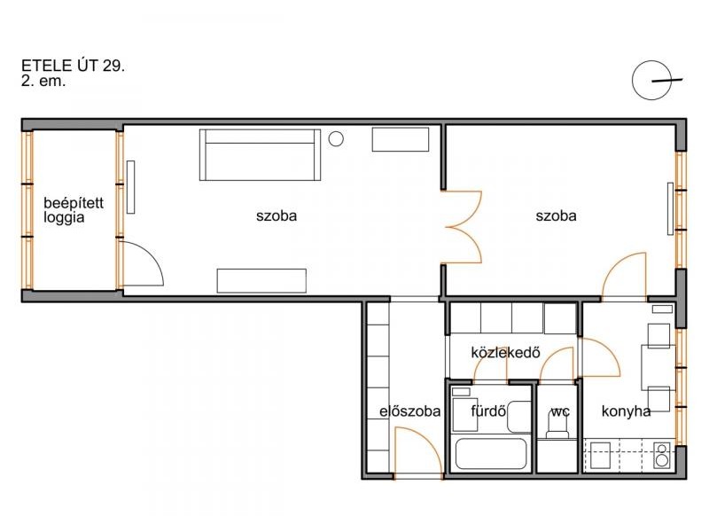 A lakás a második emeleten helyezkedik el, világos és jól átszellőztethető. Déli oldalon az Etele úttal párhuzamos zöld sávra, északi irányban a ház mögötti parkolóra és játszótérre néz.