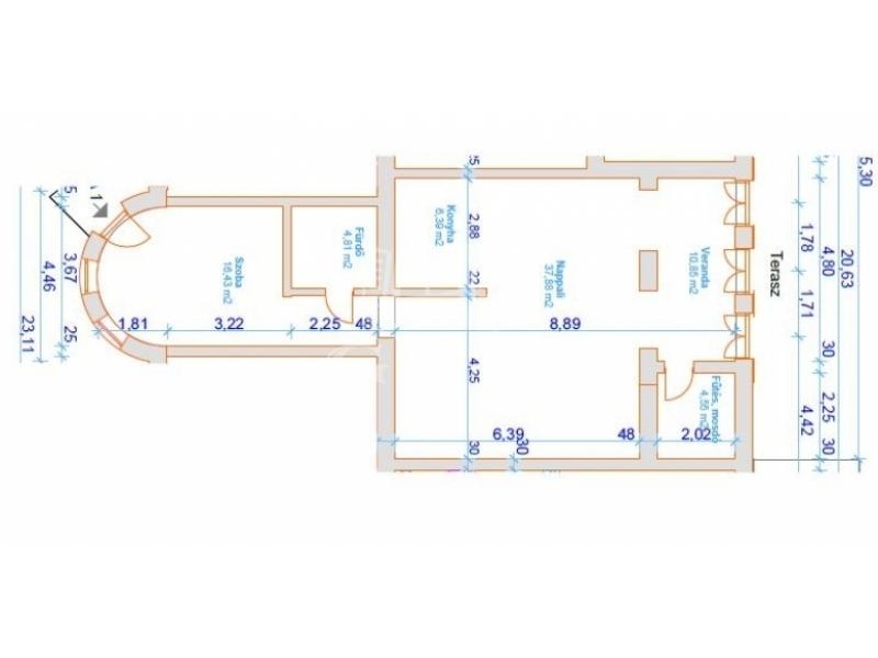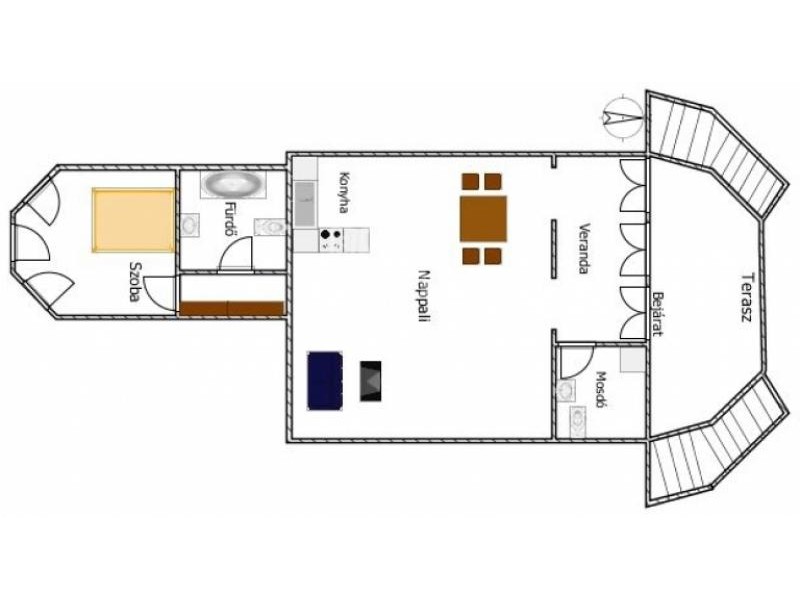 A nappali, konyha és étkező keleti tájolású, kertre néző, innen nyílik a terasz is.
