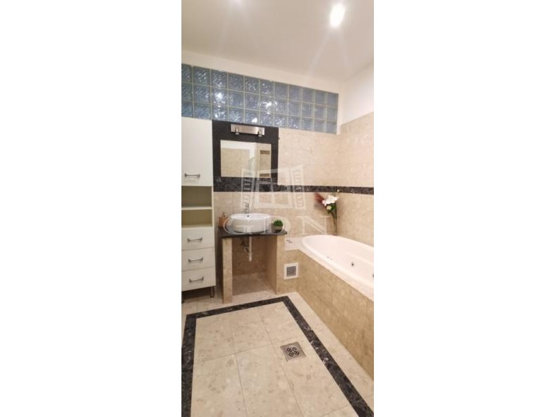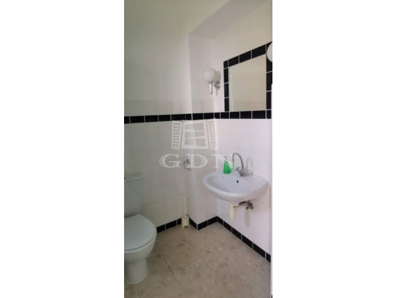 A fürdőszoba a nappali és hálószoba között található, a bejárat mellett külön háztartási helyiség WC-vel és kézmosóval. Fűtés: cirkó kazán.