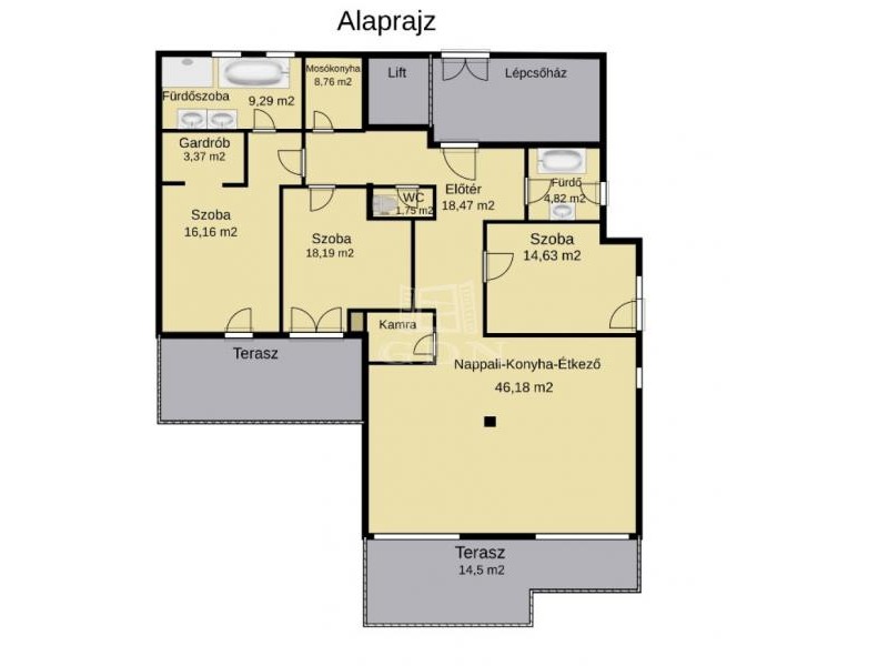 egy 22 m²-es, nagyméretű terasz, valamint egy 7 m²-es kisebb terasz, ahol pergola rendszer került kialakításra, ideális árnyékos pihenőtérként.