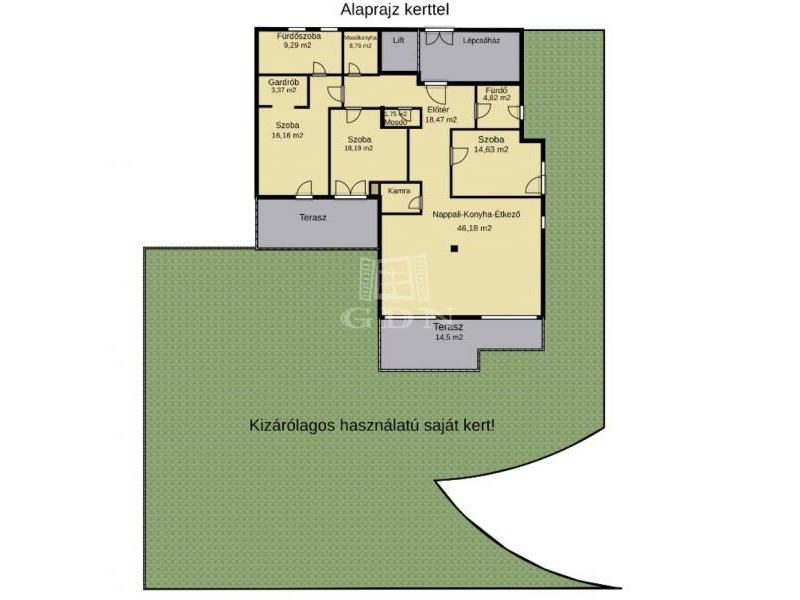Az ingatlanhoz nagyságrendileg 100 m²-es, önálló használatú kert tartozik, automata öntöző-rendszerrel ellátva.