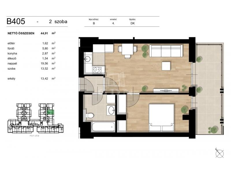 Minőségi, új építésű lakás, októberi átadással! Budapest XIII. kerületében a Hun utcában, új építésű társasházban eladásra kínálok negyedik emeleti, 45 nm-es lakást, 13 nm-es erkéllyel. A lakáshoz teremgarázs hely vásárolható 6.99MFt-ért. A kivitelező több mint 15 éve jelen van a piacon, és több mint 2.500 lakás kivitelezésében vett részt. Kiváló közlekedéssel, a belvárostól mindössze öt percre található. Bevásárlási és rekreációs lehetőségek a közelben Kiváló tömegközlekedés Gazdaságos, fenntartható otthonok Legmodernebb hőszivattyús mennyezeti hűtés fűtés, alacsony rezsi! Egyedülálló belső zöld környezet Világos életterek Hangulatos belső tér A Róbert Károly körút melletti beruházással elegáns, élhető otthonokat terveztek, fiataloknak, időseknek valamint akiknek fontos a városias de mégis zöld környezet. Részletekért, további információkért várom megtisztelő hívását! B405
