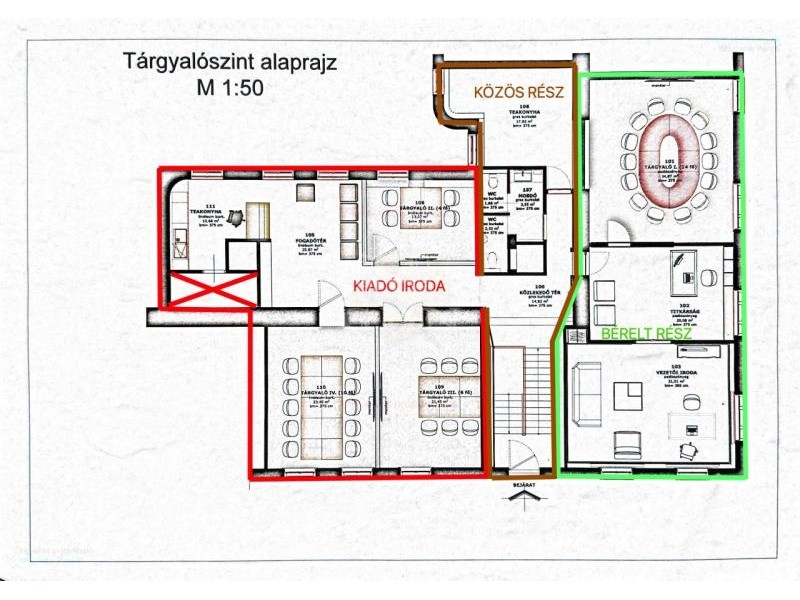 Helyiségei: lépcsőház, közlekedő, teakonyha, recepció/fogadó tér melyből 3 külön bejáratú irodahelyiség nyílik.