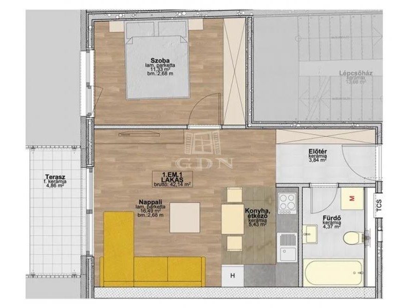 1. emelet – 42 m2 - 2 szoba – 5 m2 erkély – ELÉRHETŐ