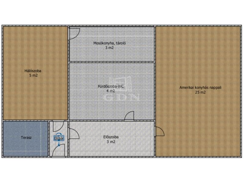 A nappali keleti fekvésű, amerikai konyhás és járólapos.