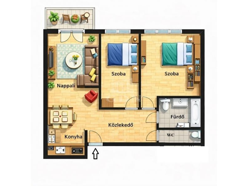 A tágas amerikai konyhás nappali közvetlen kapcsolatban áll az 5 nm-es erkéllyel, amely kellemes kikapcsolódást nyújt a mindennapokban.