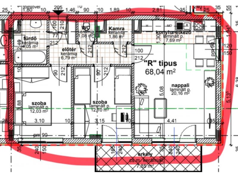 A 65 m²-es lakótérhez egy 8 m²-es terasz tartozik. Az elrendezés praktikus és jól kihasználható: amerikai konyhás nappali, két külön nyíló szoba, zuhanyzós fürdőszoba, külön WC, valamint egy háztartási helyiség is rendelkezésre áll.
