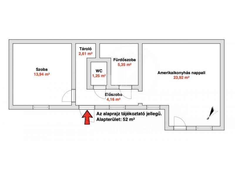 A lakás praktikus elrendezésű: amerikai konyhás nappali + hálószoba, továbbá külön fürdőszoba és WC szolgálja a kényelmet. A lakáson belül egy külön tárolóhelyiség is rendelkezésre áll.