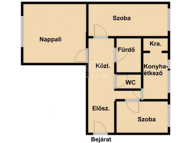 Az ingatlan elrendezése praktikus és tágas: nappali, két különnyíló hálószoba, fürdő, külön mosdó, konyha-étkező, kamra és előszoba található benne. A köztes fal elbontásával igény szerint egy még tágasabb konyha-étkező is kialakítható.