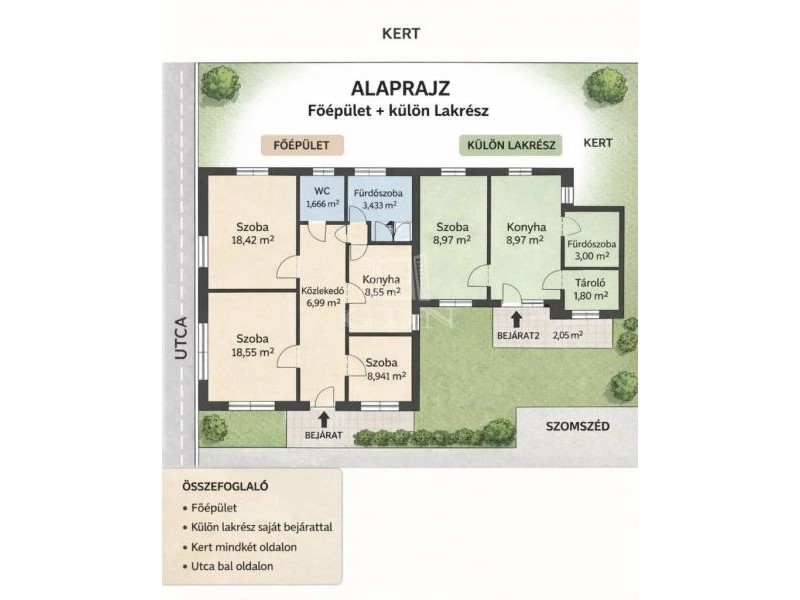 Eladó kádár kocka ház – plusz kis lakással! Akár két generációnak is alkalmas! Tágas telek, nyugodt környezet, két otthon egy helyen – Rákoscsaba újtelepen Ha olyan ingatlant keres, ahol a család együtt, mégis külön élhet, ez a 913 m²-es telken elhelyezkedő, kétlakásos lehetőség kiváló választás. A főépület egy 1972-ben épült, stabil, tégla szerkezetű családi ház, 66,4 m² alapterülettel. Elrendezése praktikus és élhető: Belmagasság: 2,9m 2,5 szoba konyha és spejz fürdőszoba külön WC előszoba pince fedett terasz zárt garázs A szobák parkettásak, a többi helyiség járólappal burkolt. A fedett terasz kellemes pihenőhely lehet, a különálló garázs pedig kényelmes parkolást biztosít. A fűtésről gáz-cirkó gondoskodik. A telken található egy külön bejáratú, 38 m²-es melléképület is, amely 3 éve teljes körű felújításon esett át. Helyiségei: Ez a ház 2,4m magas 1 szoba fürdőszoba WC-vel spejz előtér Redőnyök elektromosak. Ideális fiatal párnak, nagyszülőnek, felnőtt gyermeknek, vagy akár kiadásra is. DE akár osztatlan közös tulajdon is kialakítható belőle! A környék csendes, családbarát, mégis kiváló infrastruktúrával: buszmegálló 5 perc sétára Spar, orvosi rendelő, iskola, óvoda kb. 600 méteren belül M0 autópálya 2 km Naplás-tó 1 km – természetközeli kikapcsolódási lehetőség Az ingatlan az Otthon Start Program keretében támogatott hitellel is megvásárolható.