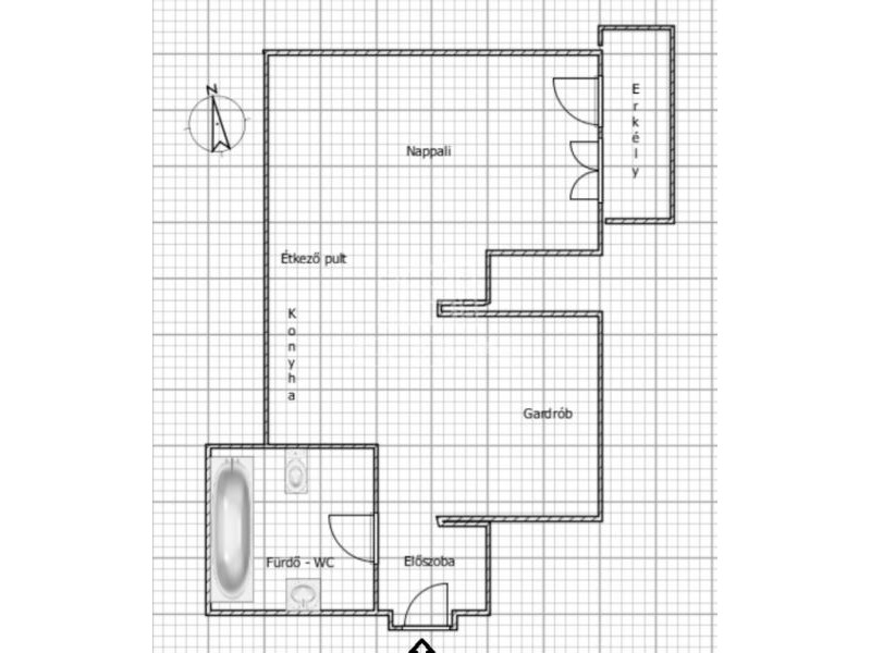 A lakás előszoba, fürdőszoba-WC, gardrób, konyha és nappali helyiségekből áll.