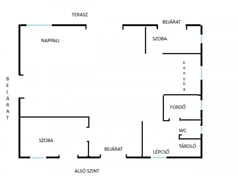 Földszint: Hatalmas, világos nappali, konyha és fürdőszoba.