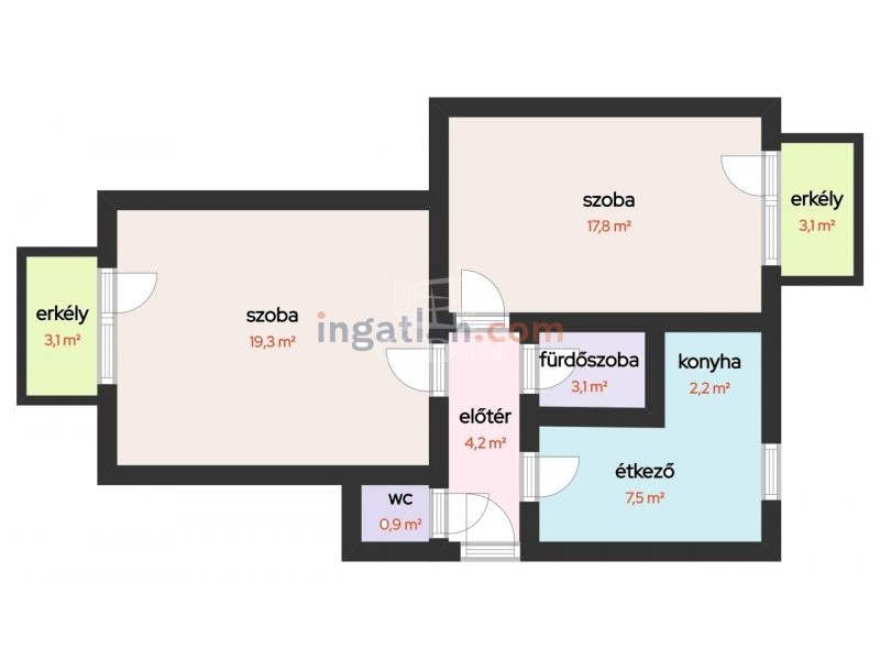 19,26m2, szoba 17,81m2, fözőfülke 2,17m2, étkező 7,52m2 fürdőszoba 3,11m2, wc 0,85m2, előszoba 4,24m2, erkély 3,1m2, erkély 3,1m2;