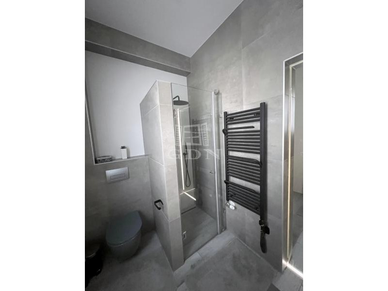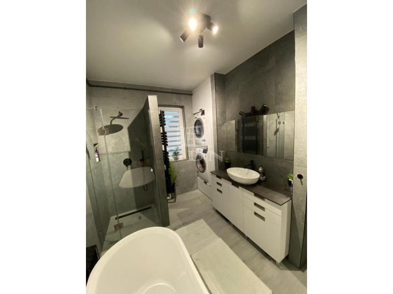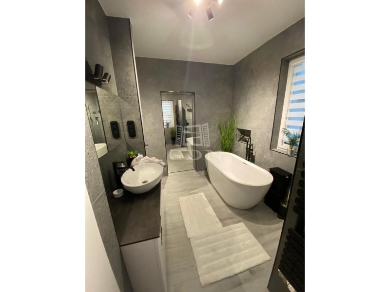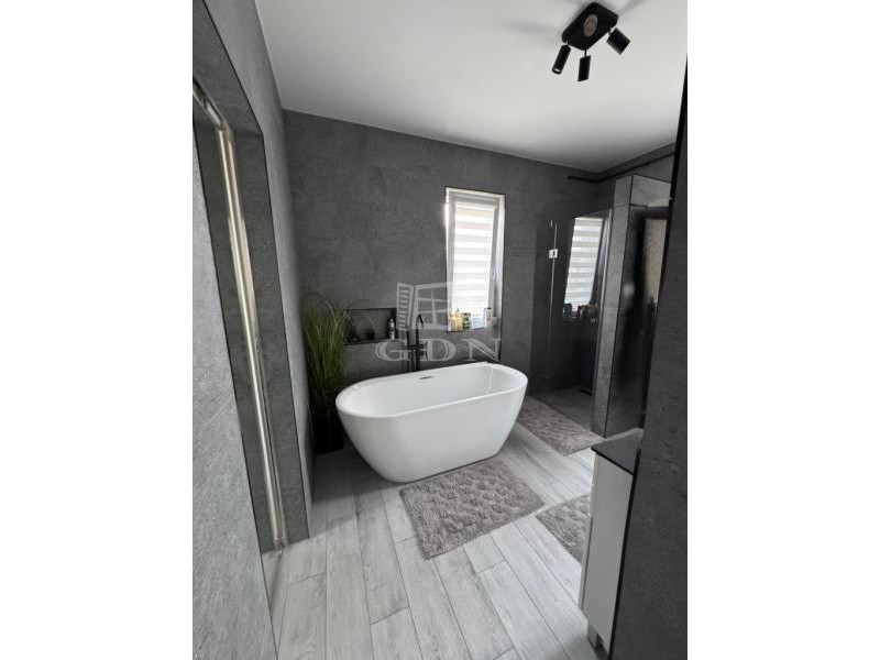 Az alaprajzhoz képest az emeleten a szülői hálószobából egy elegáns tükör tolóajtón keresztül közvetlenül is megközelíthető a fenti fürdőszoba, amely szintén prémium érzetet ad ennek a helyiségnek is.
