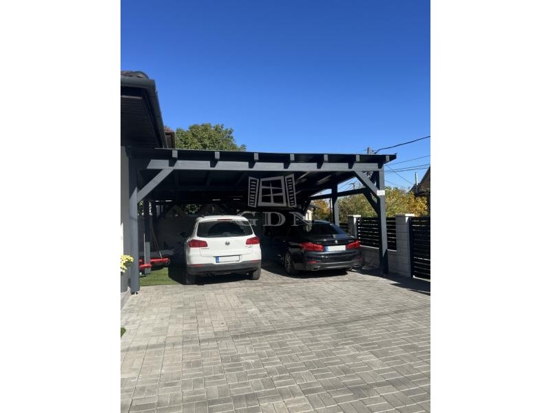 Az előkert teljes területe térkővel burkolt, így a garázson felül további 2 autó számára fedett beállási lehetőség biztosított.