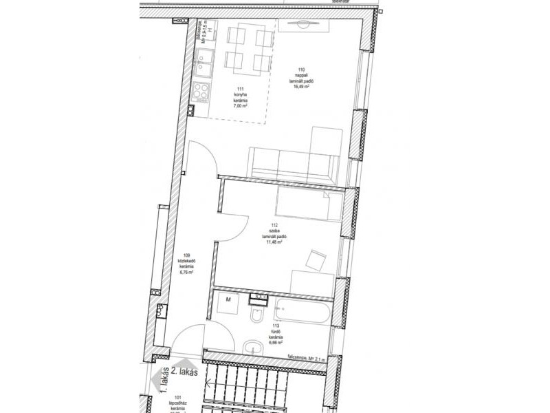 A társasház első emeltén található 48 m2-es lakás elrendezése: