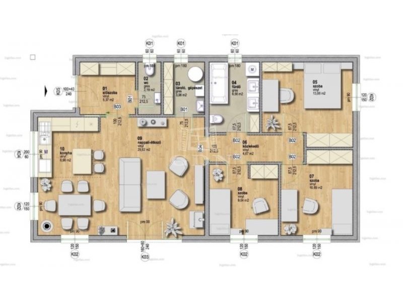 - nappaliban és hálószobákban laminált parketta, választható szín és