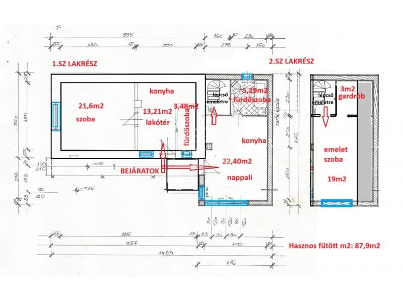 Jelenleg két külön lakrészre van bontva - kétgenerációs - igény szerint könnyedén össze is nyitható. Jól használható tároló és garázs is van