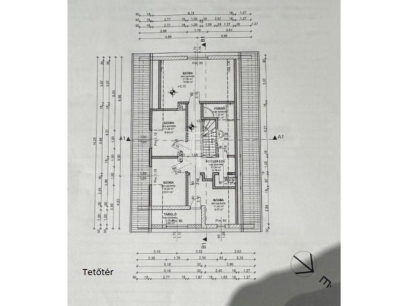 Tetőtér: 60m2 – közlekedő, 3 szoba, fürdőszoba, WC, konyha