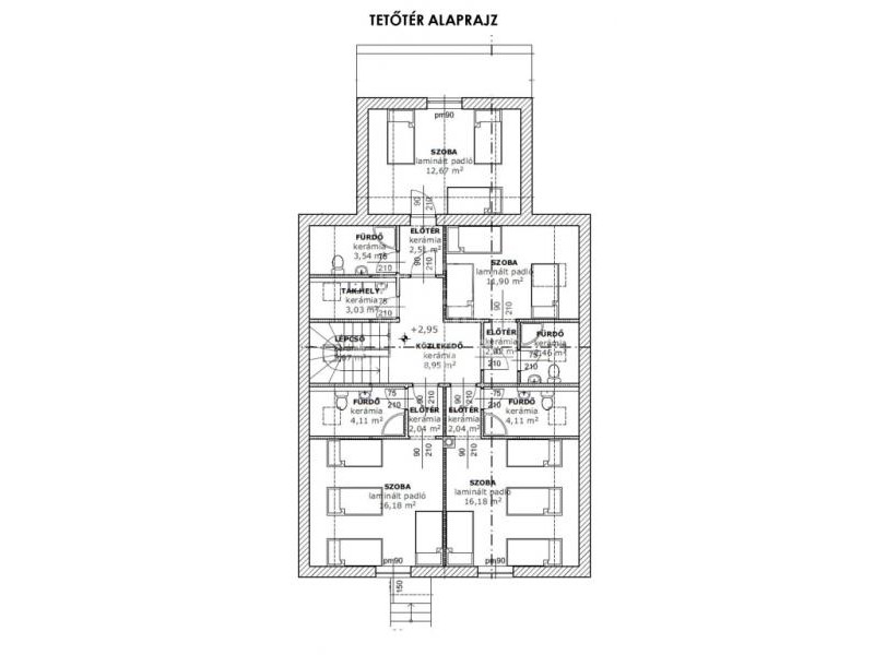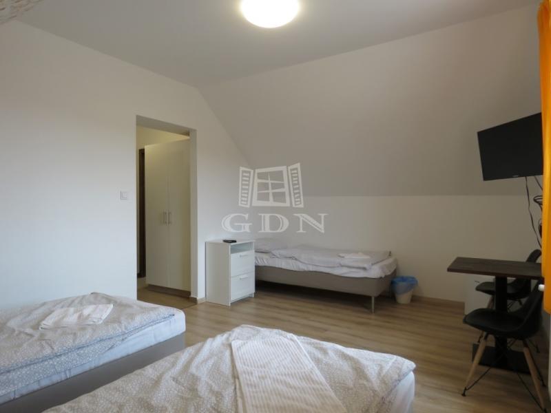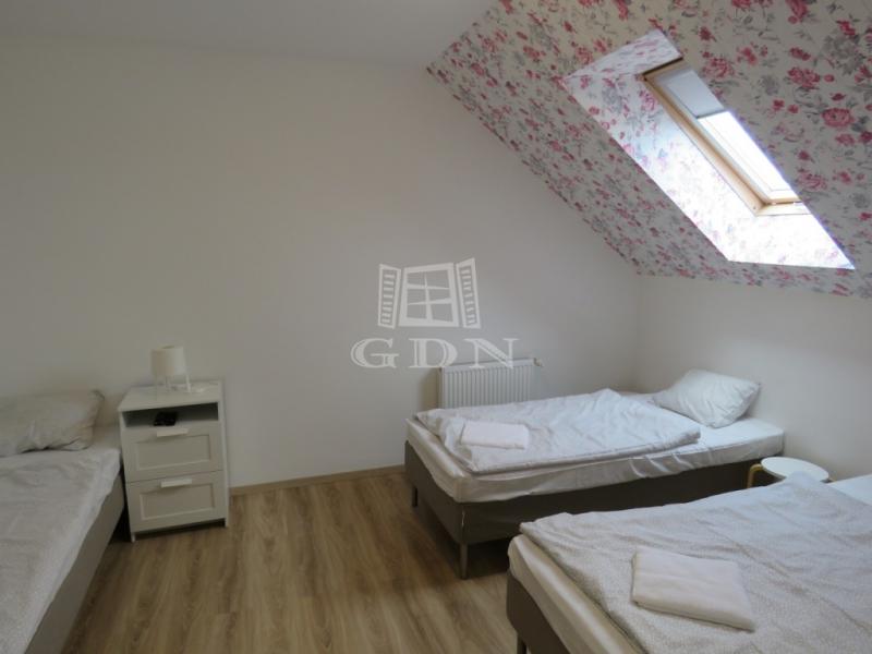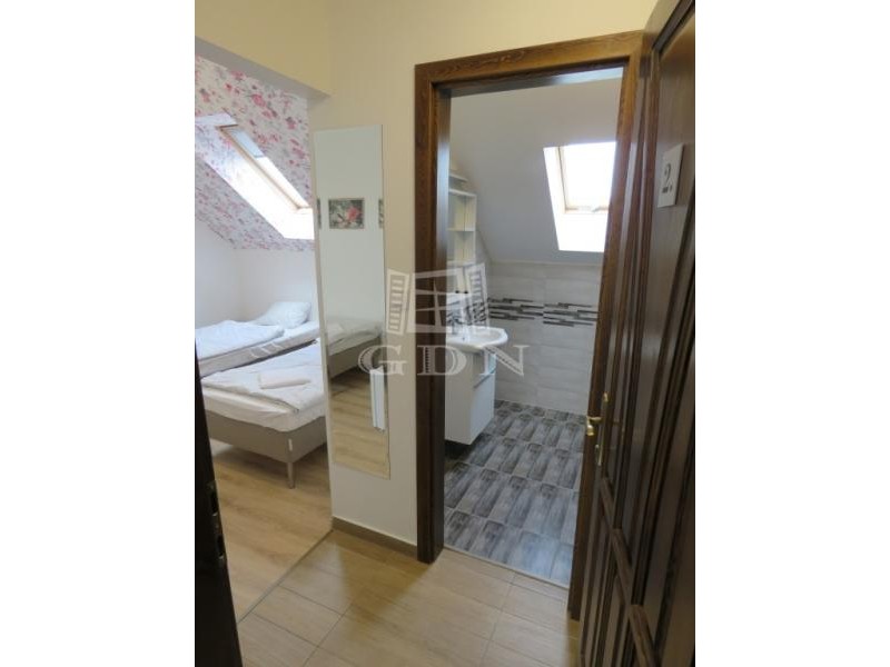 A kétszintes épület emeleten négy (2db 4 ágyas és 2db 3 ágyas), önálló fürdőszobás apartman, illetve egy teakonyha került kialakításra.