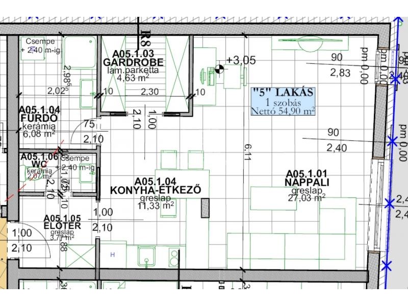 A05 lakás: 54,9 m2|konyha + étkező - nappali, hálószoba, előtér, gardrób, fürdő, wc,