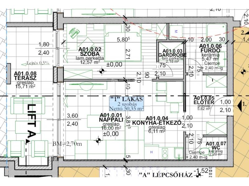 50,35m2|konyha + étkező - nappali, hálószoba, előtér, gardrób, fürdő/wc külön helyiségben (terasz: 15,71nm)