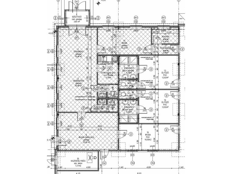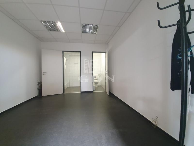 iroda/szoc. blokk: 150m2 (3 db irodából, teakonyhából, női és férfi wc-ből, szerverszobából, illetve a csarnokból nyíló női és férfi öltözőkből wc-ből és zuhanyzókból áll)