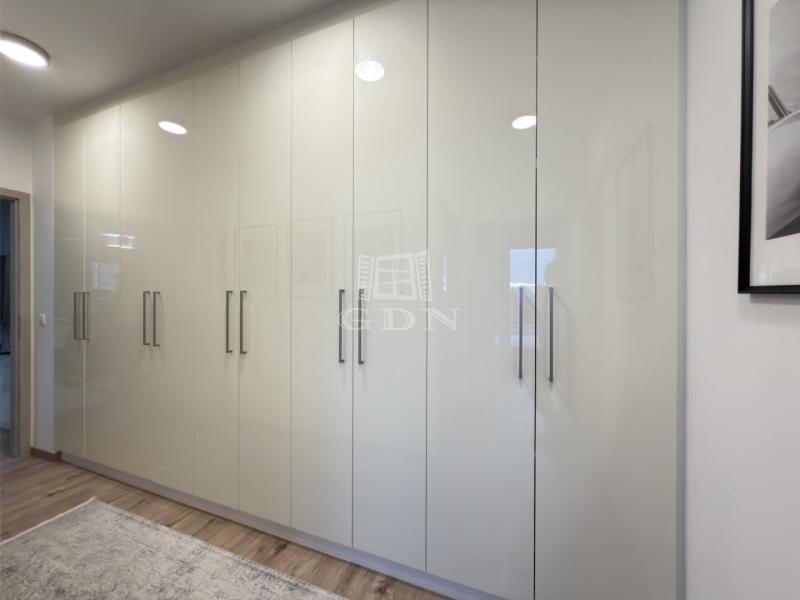 A tulajdonosok kényelmét tovább növeli, hogy a lakás szintjén egy saját, zárható, 6,46 m²-es tároló is rendelkezésre áll, amely a vételár részét képezi. A társasház elektromos kapun keresztül megközelíthető, fedett garázsában két gépkocsibeálló tartozik a lakáshoz, amelyek szintén benne vannak az árban. Az eladási ár tartalmazza továbbá a beépített szekrényeket — az előszobában, gardróbban, fürdőben és a nappaliban — valamint a modern, gépesített konyhabútort is.