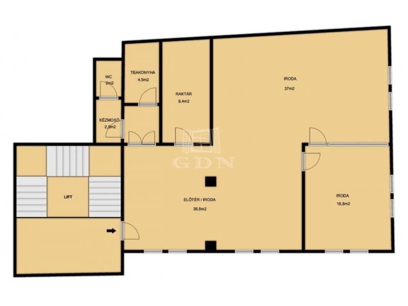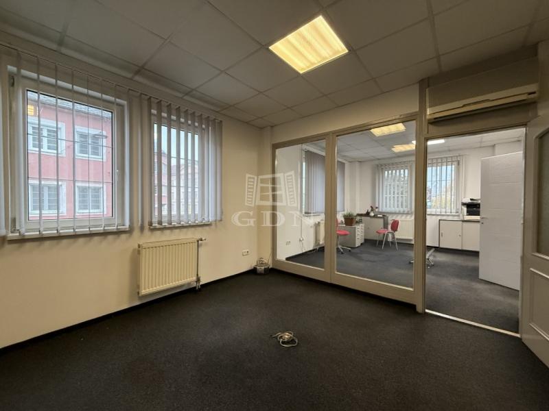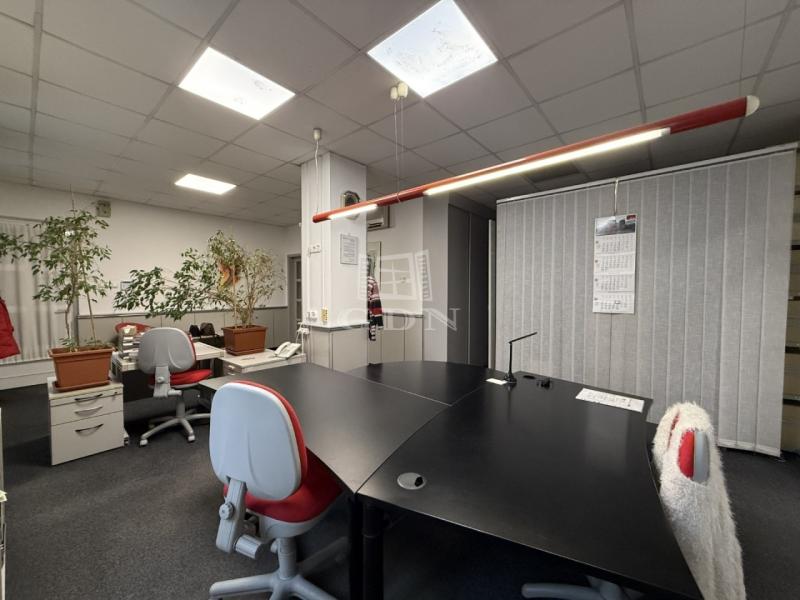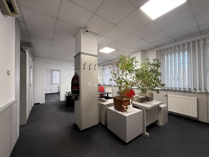 Elosztását tekintve eredetileg egy előtérből, három különálló irodából, egy kisebb raktárból, valamint konyha-étkezőből és mellékhelyiségből állt. Jelenleg két tágas, világos, egybenyitott irodatér és egy külön irodahelyiség alkotja.