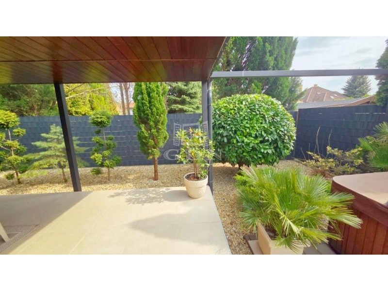 A kb. 550 m2-es telek tudatosan alacsony fenntartásúra lett kialakítva. Minőségi műfű, dekoratív kőfelületek és mediterrán növényzet biztosít kellemes hangulatot rendszeres gondozás nélkül. A privát szféra kiváló: sem az utcáról, sem a szomszédok felől nincs közvetlen belátás.
