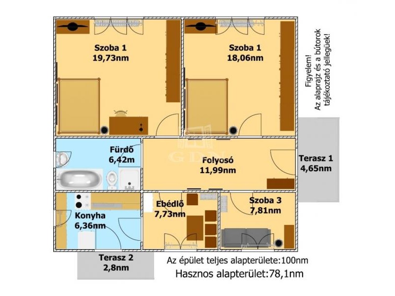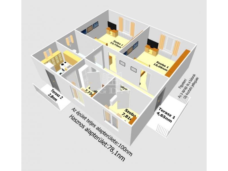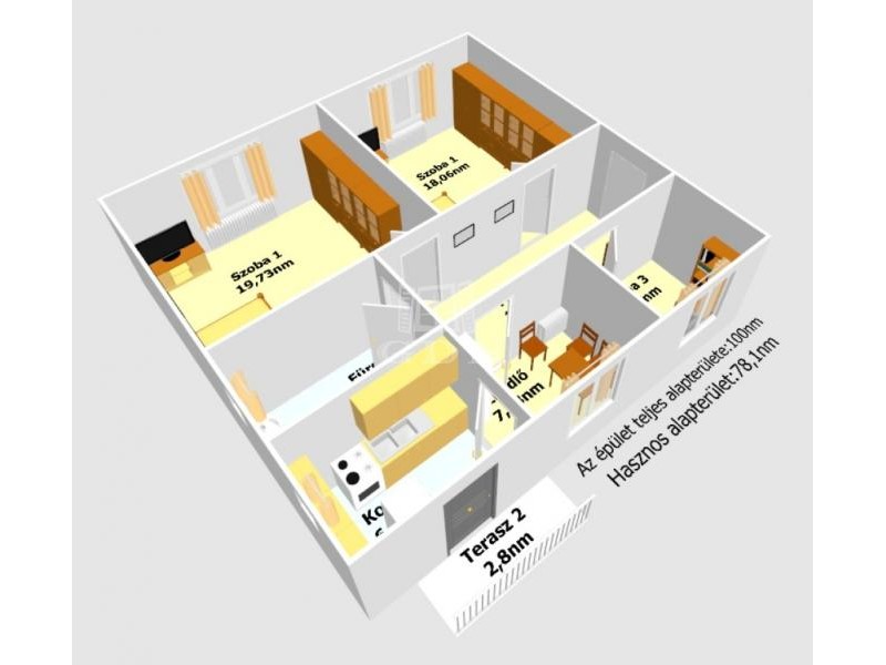 A főépület hasznos alapterülete 78,1nm melyben található: