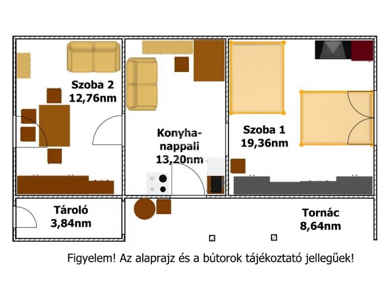 A kertes ház hasznos alapterülete 45,36nm, melyben található: