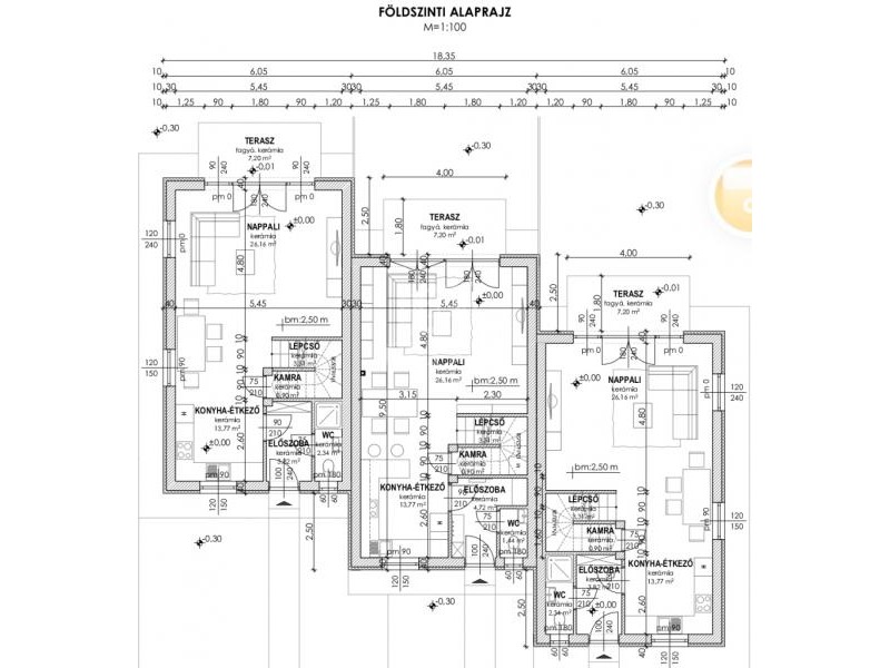 Földszinten, 50 nm nagyságú területen egy nagy méretű amerikai konyhás nappali, előszoba, kamra, mosdó. A földszintet egy terasz egészíti ki.