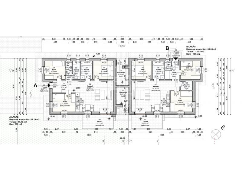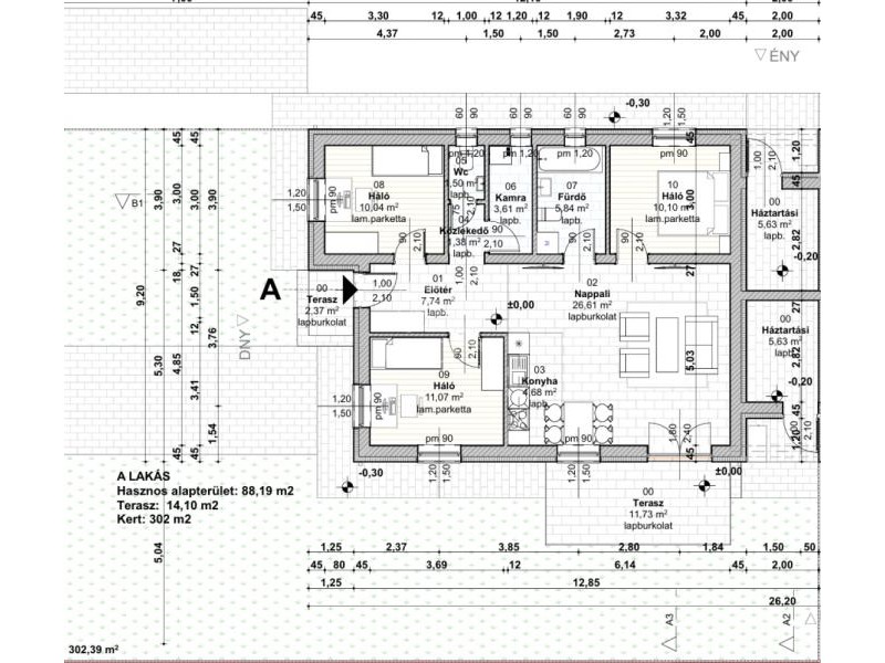Elrendezés és helyiségek méretei: előszoba: 5,64 m², nappali: 29,24 m², konyha: 5,30 m², szoba 1: 12,28 m², szoba 2: 10,04 m² szoba 3: 9,66 m², fürdőszoba: 5,82 m², külön WC: 1,50 m², kamra: 2,96 m²,