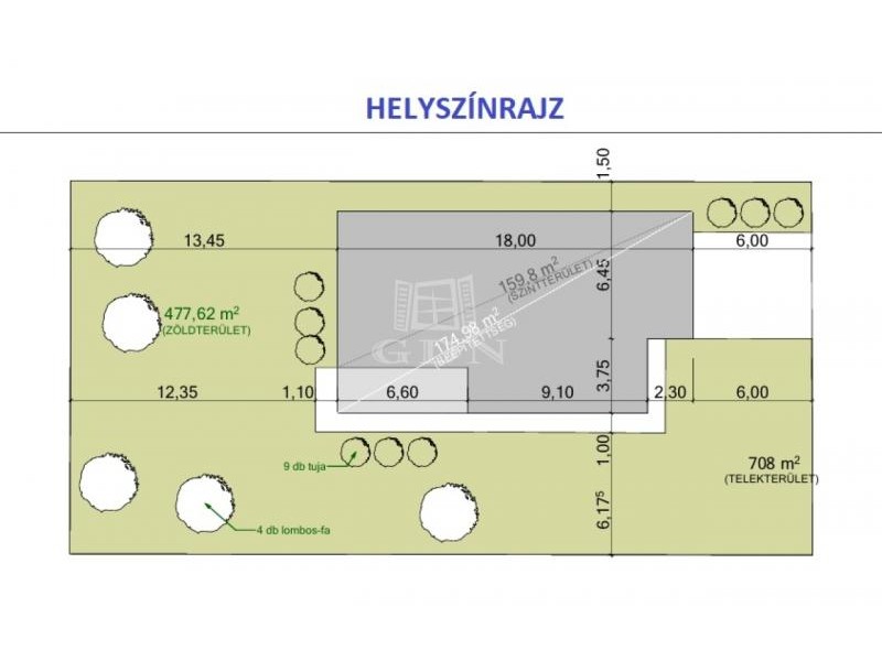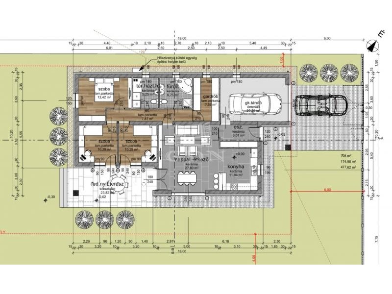 A ház nettó 125 nm, plusz a 24 nm terasz. Mindez 708 nm telken.