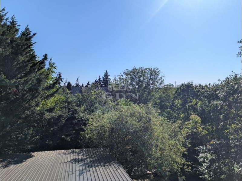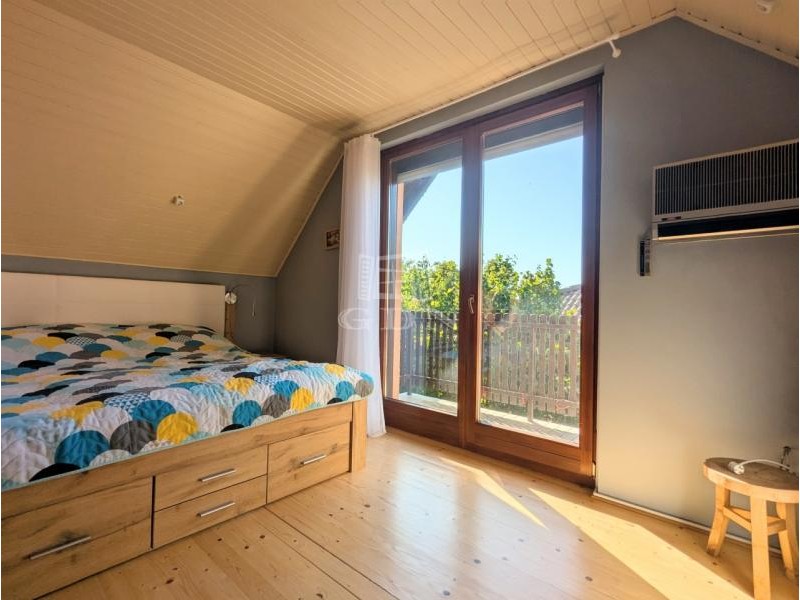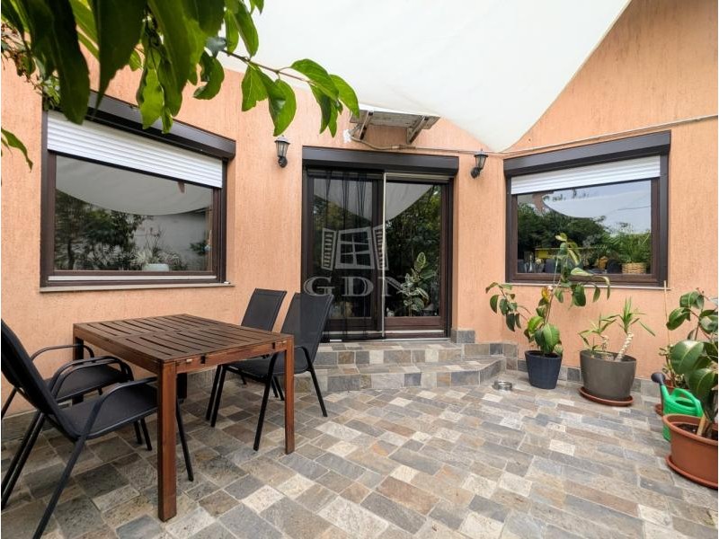Az 576 m²-es, gondozott telek napos, mégis árnyékos, fákkal és gyümölcsökkel beültetett.
