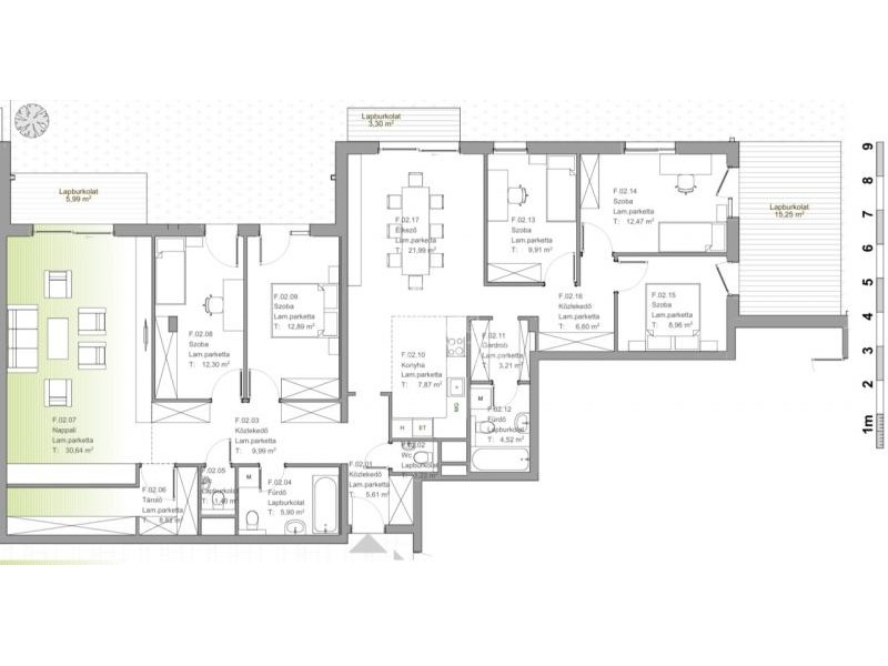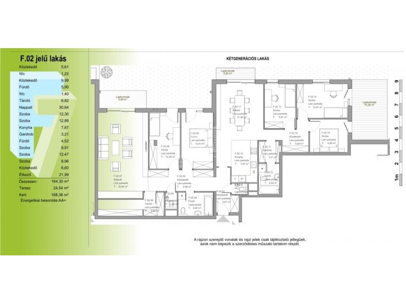A 4 szintes (P+FSZT.+IEM.+IIEM) társasház 11 db lakást tartalmaz amiből 2 db lakás kétgenerációs kialakítású. A lakások rendelkeznek kert, erkély és tetőterasz valamelyikével. Továbbá lakáson belüli / kívüli tároló lehetőséggel. Akadálymentes bejutás az épületbe.