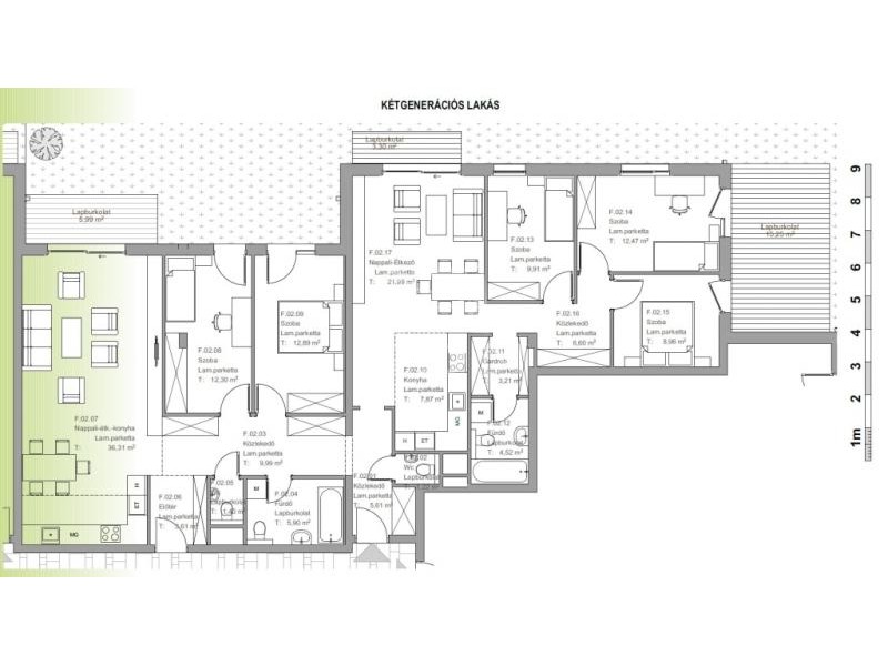-F.02 lakás 164,3 m2; terasz: 32,85 m2; kert: 168,36 ár: 248.000.000,-Ft.